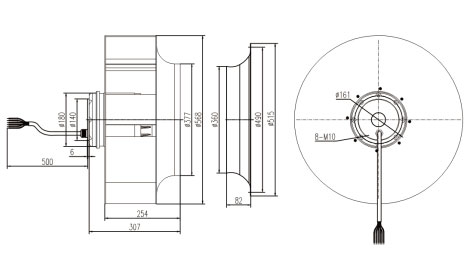 2. 材料:高效外转子交流电机、后倾式圆弧形铝合金叶轮、免维护深沟球滚珠轴承、静电粉末喷塑转子