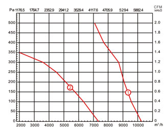 1. 性能参数:由4极和6极额定电压为400V,频率50Hz的三相异步电机组成,可通过接线法Y/△转换来实现双速,抽头调速可以实现多种转速。额定电流为2.24/1.29A和1.19A/0.70A,最大风量在为9000m3/h到10300m3/h之间。